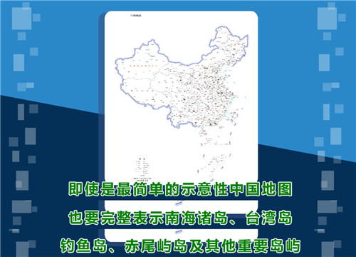 国家版图是一个国家行使主权的疆域,包括领土和有一定主权权利的国家管辖海域。正确的国家版图必须完整、准确反映中国领土范围。即使是最简单的示意性中国地图,也要完整表示南海诸岛、台湾岛、钓鱼岛、赤尾屿岛及其他重要岛屿。