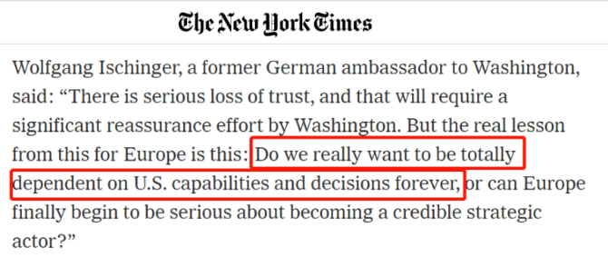 △德国前驻美大使沃尔夫冈·伊申格尔表示,“对欧洲来说,真正的教训是“我们真的想永远完全依赖美国的能力和决策吗?”