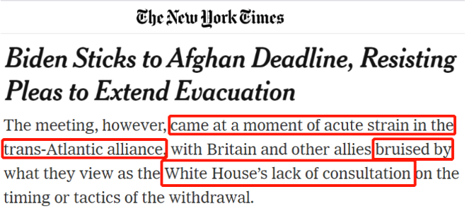 但对这些盟友来说,现在有更清楚的事实摆在眼前,那就是:如果他们想要为自己的利益服务,就目前的情况来看,他们的能力是不够的。这正是美国有线电视新闻网(CNN)在《阿富汗撤军使盟国面临美国退出世界舞台的严酷现实》一文中指出的观点。文章还认为,那些长期依赖美国承诺的稳定来推动西方价值观的国家,将需要重新思考自己的外交政策。