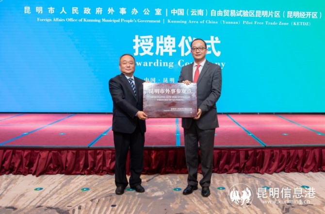 仪式上,昆明市人民政府外事办公室主任张晓明授予中国(云南)自贸区昆明片区综合服务中心“昆明市外事参观点”,中国(云南)自贸区昆明片区(昆明经开区)党工委委员、管委会副主任徐春接牌。