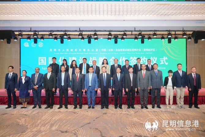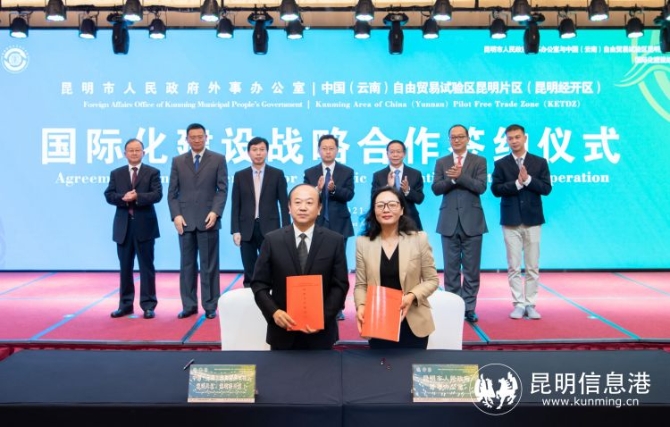 昆明市人民政府外事办公室副主任何云屏与中国(云南)自贸区昆明片区(昆明经开区)党工委委员、管委会副主任王月冲签订《国际化建设战略合作协议》。出席领导和中外嘉宾共同见证签约。