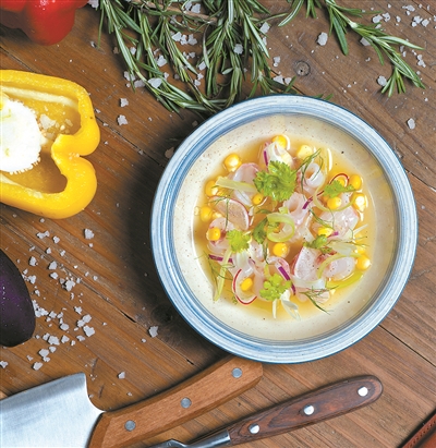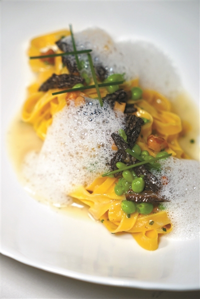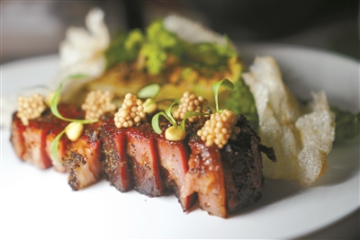 炭火烤过的章鱼下有甜辣蛋黄酱,上有罗勒、柠檬丁和风干番茄调成的秘制酱,被双酱“夹攻”的章鱼十分柔软,细问之下,原来那柔软源自特别的处理方法:章鱼先快速焯水,然后低温慢煮,最后再轻煎,口感十分特别。炖脸颊肉竟然油花丰富到入口即化,却不失香口,秘诀就在于肉在经过慢炖之后进行轻煎,烟熏浓郁的蜘蛛菜沙拉的配搭带来转角的惊喜。