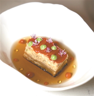 在这里,创新料理和现代时尚相融合,中西食材被他充分运用了起来。即便是简简单单的茄子、鸡蛋、章鱼,都能在他的演绎下释放不一般的光彩。用勃艮第酒腌制过的有机鸡蛋,当刀叉从它表皮轻轻划开时,金黄的蛋液顺流而下,淌开在菠菜、面包丁、蟹味菇、5J伊比利亚火腿及帕马森芝士片上,配合慢煮的红酒汁迸发出新的风味,这便成为一颗不平凡的鸡蛋。