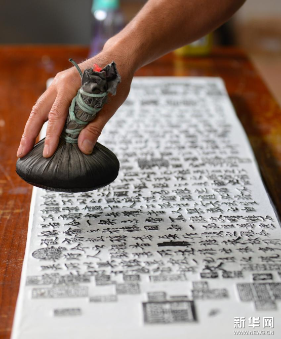 9月1日,衡水法帖雕版拓印技艺的代表性传承人李广民在拓印作品。新华社记者 金皓原 摄