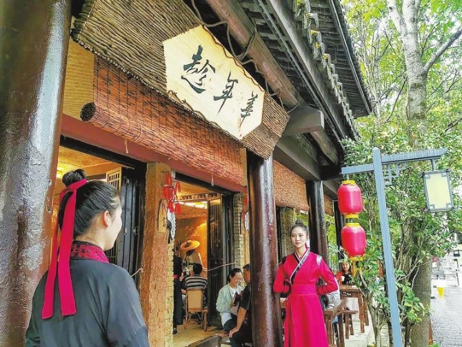 店小二、厨子一应古装打扮,“黑玉断续膏”“八部众神茶”“化骨绵掌”等众多取自古籍或侠客“江湖”的茶品点心名称,让来客瞬间有一种将“江湖”一饮而尽的快意之感。茶馆的后院,几处茅草屋顶做的小棚,草木葱郁。若逢雨天,雨珠串联成丝从茅草尖滑落,身穿蓑衣头戴斗笠的客官于茅草屋下避雨,更添一份江湖之大、四海为家的豪气与洒脱。