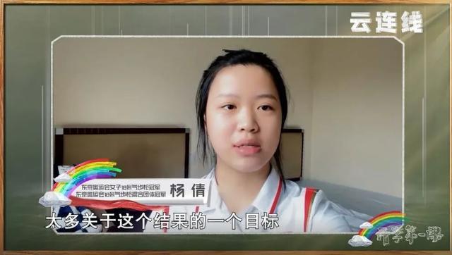 《开学第一课》中,主持人康辉在云连线杨倩时,问她是否在赛前就有夺冠的自信,杨倩只是淡淡地说:“在赛前的时候,并没有给自己设立太多关于结果的目标,更多的还是想去做好这个过程,在建党一百周年,能够代表国家出征,也是我的荣誉和一个责任。”