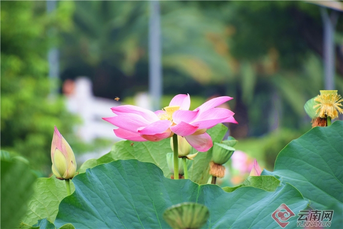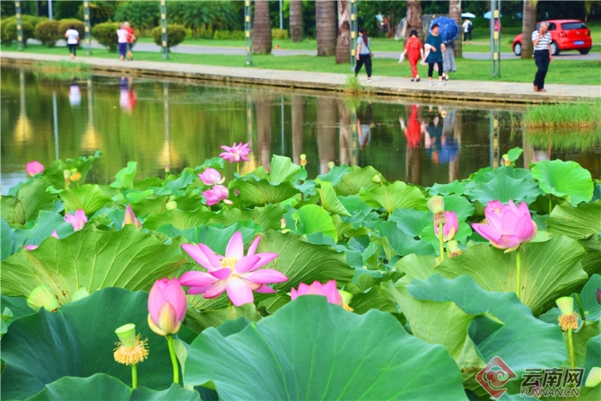 入秋以来,由于纬度、气候、土壤等原因,云南省红河哈尼族彝族自治州弥勒市甸溪河湿地公园、湖泉生态园、湖泉柳园等地,枯萎的莲蓬与红的荷花、绿的荷叶构成一幅秋色美丽图画。在残荷旁又开出新荷花,给人以“碧水映残荷,秋风摇红枝”之感,吸引了成千上万的游客和市民驻足观赏残荷,他们或拍摄抖音、快手,或合影留念。