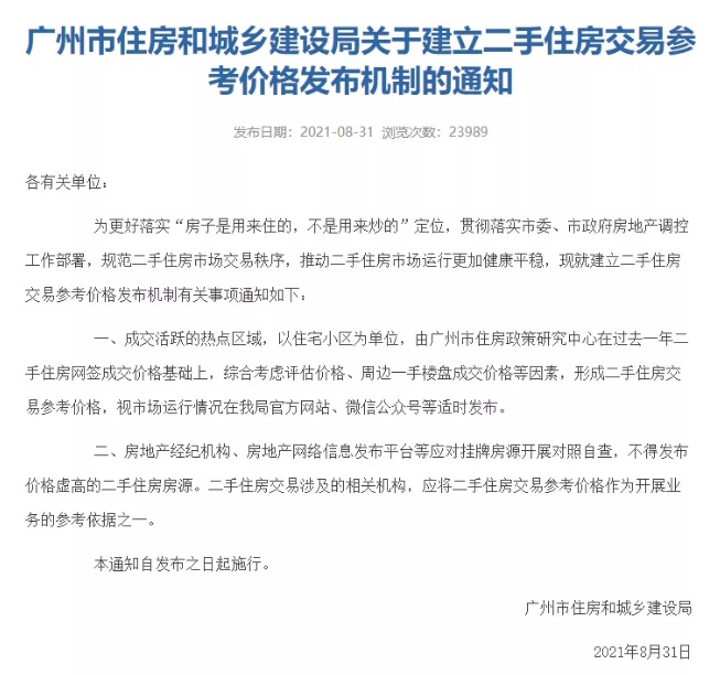 8月31日晚间,广州市住房和城乡建设局发布《关于建立二手住房交易参考价格发布机制的通知》,明确建立二手住房成交参考价格发布机制,为二手住房交易提供市场参考,并同步公布了首批96个位于成交活跃的热点区域的住宅小区,涉及天河、越秀、海珠、番禺、黄埔5个热门区域,其中天河区54个。