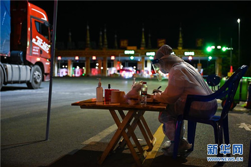 7月8日晚,在瑞丽东高速公路收费站,防疫人员记录物资车辆信息。
