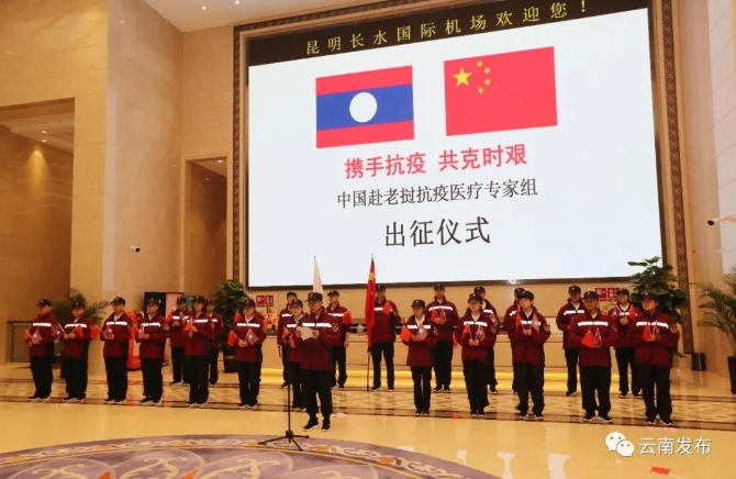 2021年5月4日,中国赴老挝抗疫医疗专家组出征仪式在昆明长水国际机场举行。仪式结束后,专家组一行乘机启程赴老挝万象协助开展疫情防控工作。这是云南省按照国家有关部门安排,承担国家任务,第二次向老挝派出抗疫医疗专家组。