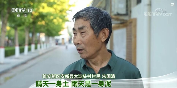 雄安新区安新县大淀头村村民 朱国清:过去常说“晴天一身土,雨天是一身泥”。过去这都是土地面,一下雨,你穿胶鞋都没半截。现在到处都是硬化了,绿化了,有车有房,我们饮水都是自来水,一拧都入了户了,非常方便,这真是到了小康社会。