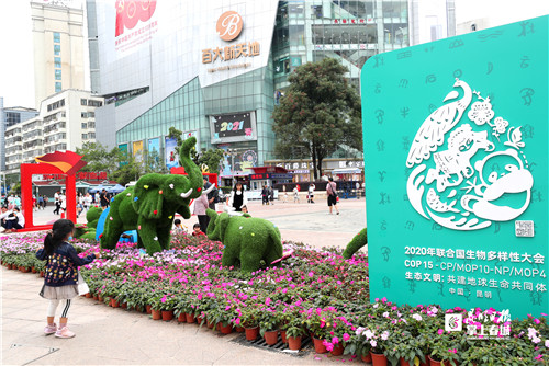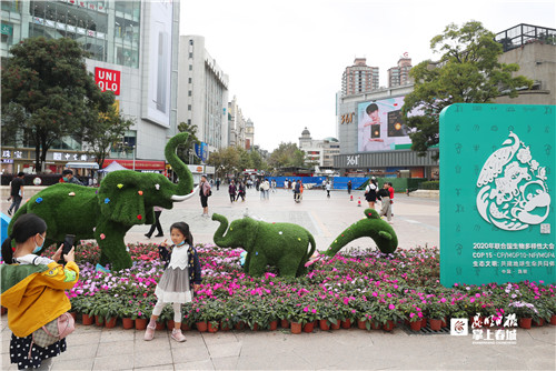 在市中心的三市街,“大爱昆明——喜迎生物多样性”主题花园内绿意盎然,搭配白色气球布景,既精致又美观。作为昆明“城市会客厅”的南屏街,也打造了多个主题区域,喜迎COP15。在东风广场南太桥边,一组以鲜花小品为主体的COP15倒计时牌,正提醒广大市民距离盛会召开的时间。