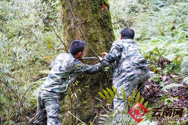 工作人员在测量水青树的胸径。昌宁融媒体中心供图