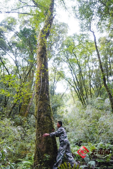 工作人员在查看水青树的生长情况。昌宁融媒体中心供图