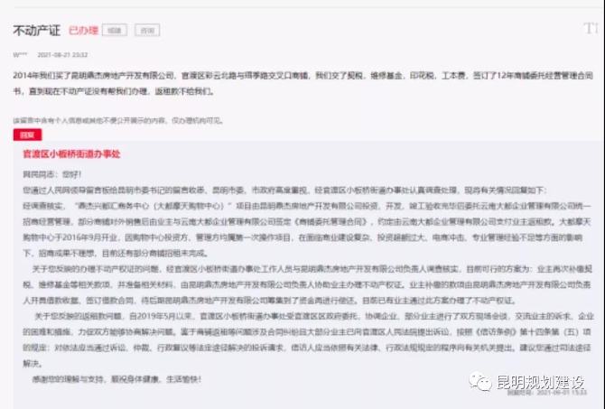 这位网友称,“2014年我们买了昆明鼎杰房地产开发有限公司,官渡区彩云北路与珥季路交叉口商铺,我们交了契税,维修基金,印花税,工本费,签订了12年商铺委托经营管理合同书,直到现在不动产证没有帮我们办理,返租款不给我们。”