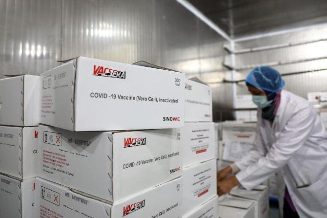 经过药液注射、贴标等生产线自动化流程后,这些带有VACSERA-Sinovac标签的小药瓶便由戴着医用头套、口罩、手套的工作人员整理后放入特制冰箱中保存。