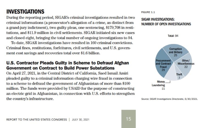 7月30日,SIGAR发布的美国国会季度报告是美军全面撤离阿富汗前最后一份季报,但这份季报中的“瓜”一点都不少。报告罗列了众多美方人员的刑事案件:一名美国政府承包商通过竞标作假,拿到美国国际开发署资助的阿富汗国家电力建设项目;美国国民警卫队一名负责后勤的士官,以坎大哈驻军公务使用的名义,订购了大批电脑和家具,并运回到自己在田纳西的家中;一家为阿富汗美军提供空运服务的承包商,使用年久失修的直升机,违背了承包合同,被迫向美国政府缴纳1108万美元的庭外和解费;还有一名美国承包商,利用职务之便,伙同他人从坎大哈机场偷走了发电机和汽车等设备,被判入狱51个月等等。