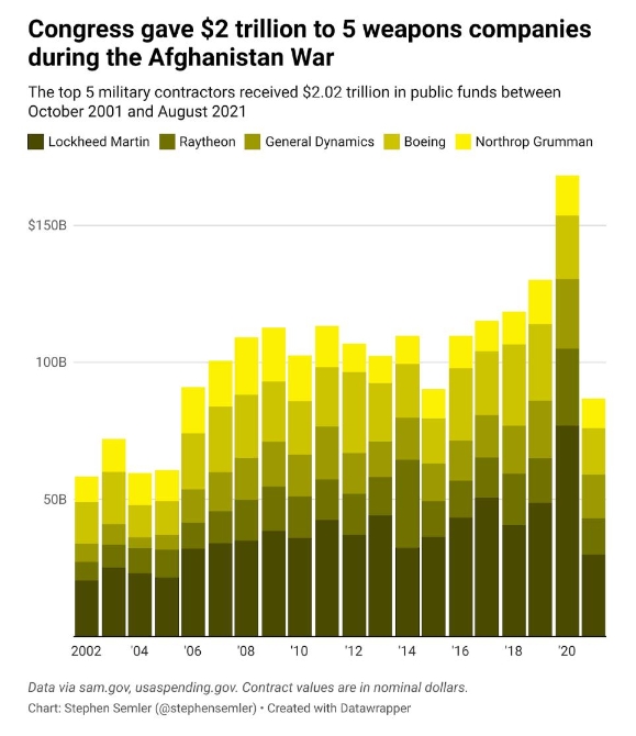 上面提到的都是小苍蝇,虽然案件频发,但多为几十万、几百万美元的“毛毛雨”,真正从阿富汗战争款中捞大钱的,还得数那些能给美国政府施加重要影响的军火巨头。一家美国民间安全政策智库“安全政策改革研究所”(SPRI),根据美国联邦总务署(GSA)的公开数据,统计出在20年的阿富汗战争中,五大军火承包商,总共从国会手中拿到了超过2.02万亿美元的资金。而根据SIGAR自己的统计数据,美国政府花在阿富汗的钱,重建经费和军费加起来也才不过9820亿美元,而布朗大学做的一份阿富汗战争支出估计,则有2.26万亿美元。可以说,阿富汗战争开支对于美国而言,就是一笔糊涂账。当然,账越乱,浑水摸鱼的机会也就越多。根据《外交政策》的文章,美国刚刚占领阿富汗时,阿富汗当地警察是长期受苏式训练的,使用的也是苏制和俄制装备。美国人来到以后,不顾阿富汗的国情,如高文盲率等,强行培训使用美式装备的新安全队伍,并引进一些比俄制武器昂贵、娇嫩的美式装备,当然结果也显而易见。美国援助阿富汗警察和士兵装备的采购费用,就这样源源不断流入军火商的腰包里。