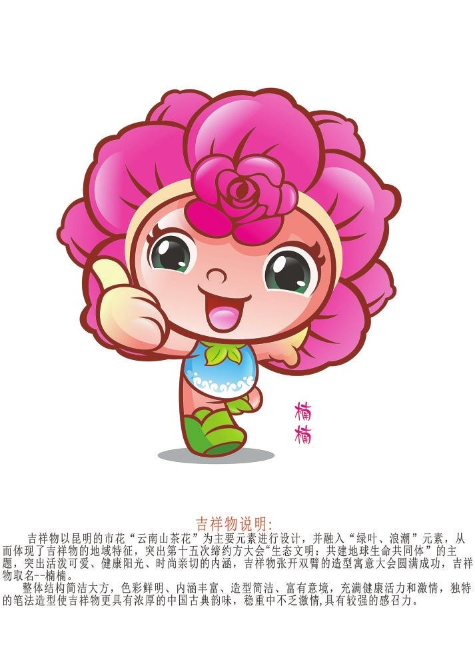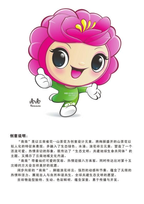 设计说明:吉祥物以云南省花——山茶花为主要元素进行设计,并融入“绿叶、浪潮”元素,从而体现了吉祥物的地域特征,突出第十五次缔约方大会“生态文明:共建地球生命共同体”的主题,突出活泼可爱、健康阳光、时尚亲切的内涵,吉祥物张开双臂的造型寓意大会圆满成功,吉祥物取名——楠楠。整体结构简洁大方,色彩鲜明、内涵丰富、造型简洁、富有意境,充满健康活力和激情,独特的笔法造型使吉祥物更具有浓厚的中国古典韵味,稳重中不乏激情,具有较强的感召力。