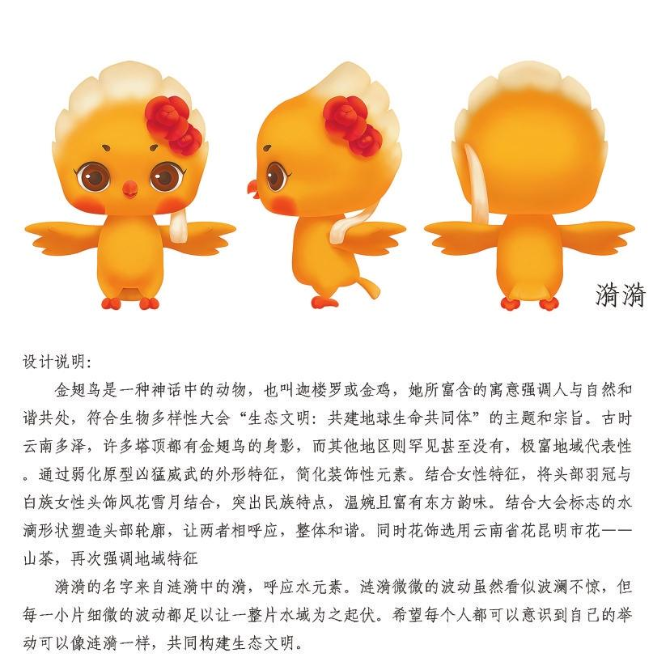 设计说明:金翅鸟是一种神话中的动物,也叫迦楼罗或金鸡,她所富含的寓意强调人与自然和谐共处,符合生物多样性大会“生态文明:共建地球生命共同体”的主题和宗旨。古时云南多泽,许多塔顶都有金翅鸟的身影,而其他地区则罕见甚至没有,极富地域代表性。通过弱化原型凶猛威武的外形特征,简化装饰性元素。结合女性特征,将头部羽冠与白族女性头饰风花雪月结合,突出民族特点,温婉且富有东方韵味。结合大会标志的水滴形状塑造头部轮廓,让两者相呼应,整体和谐。同时花饰选用云南省花昆明市——山茶,再次强调地域特征。漪漪的名字来自涟漪中的漪,呼应水元素。涟漪微微的波动虽然看似波澜不惊,但每一小片细微的波动都足以让一整片水域为之起伏。希望每个人都可以意识到自己的举动可以像涟漪一样,共同构建生态文明。