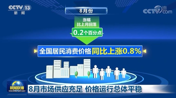 数据显示,8月份全国居民消费价格同比上涨0.8%,涨幅比上月回落0.2个百分点。