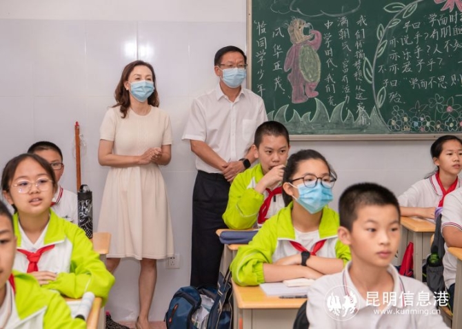 在昆明市第三中学经开区学校,李河流现场观摩了初中和高中班级的“云课堂”试点教学,并与教职工座谈交流,送上节日祝福。