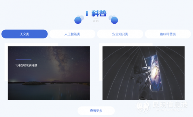 i科普板块以科普知识为主题,归纳整理天文类、人工智能类、安全知识类等科普知识,作为线上互动的内容集中展示,同时开展有奖知识竞答。