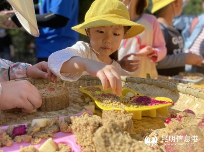随后,小朋友们拿起馅料,按模具做起来,气氛热火朝天。不一会,就做出了一大盘各种各样的月饼。今年7岁的小朋友唐果胆子大,一手抓起面包虫填料到模具里,做成面包虫月饼。他说,自己超级喜欢动物,今天早上7点就起床就是为了参加今天的活动。