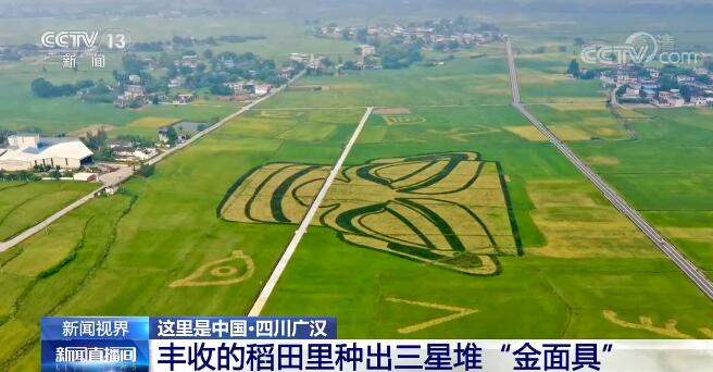 当传统的稻田遇上创新艺术,秋天就多了收获之外的味道。在国家级现代农业产区核心区——四川广汉金鱼镇上岺村,一幅巨大的“三星堆青铜面具”稻田画露出“神秘微笑”,颇为震撼。这个“面具”占地50多亩,通过GPS精准定位,人工种植而成。随着季节的变换,不同颜色的水稻呈现出不同的画面。今年,广汉人民用自己的方式庆祝丰收,这和古蜀人丰收祭祀一脉相承。