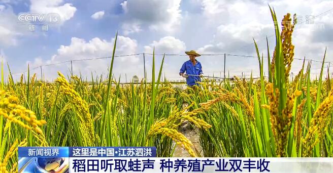 近期,江苏宿迁泗洪县千亩稻蛙共作基地迎来了双丰收。蓝天白云下,沉甸甸的稻穗一片金黄,密密麻麻的黑斑蛙即将上市。今年,泗洪县发展稻蛙共作面积近5000亩,产值将突破1亿元。为了提高稻蛙附加值,还建起产品研发中心和生态有机大米生产线,带动300余人家门口就业。