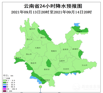据消息,9月13日20时到14日20时,昭通北部、丽江东部、红河南部、普洱南部、西双版纳、临沧南部多云间阴有小到中雨局部大雨,其它地区多云转阵雨局部中雨。