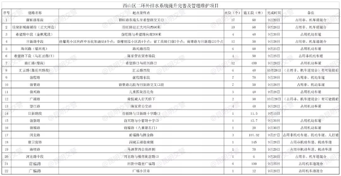 临时占用西山区20条道路部分机动车道、非机动车道、人行道进行排水系统提升完善及管理维护施工,施工期间涉及占用机动车道的施工,每次只能占用1条机动车道,确保剩余机动车道通行正常;涉及占用非机动车道的施工,确保剩余不低于3米宽的非机动车道供非机动车通行;涉及占用人行道的施工,确保剩余不低于2米宽的人行道供行人通行。