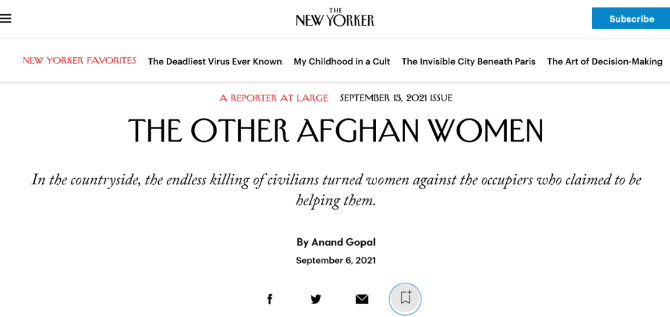 这也引发了《纽约客》的作者思考:不让塔利班夺权,可以保护喀布尔那些大城市女性的女权,但这意味着要不断在乡村地区和塔利班作战,这对于那些一直在受苦受难的乡村女性公平吗?一群人的权利,需要靠剥夺另一群人的权利来维持吗?