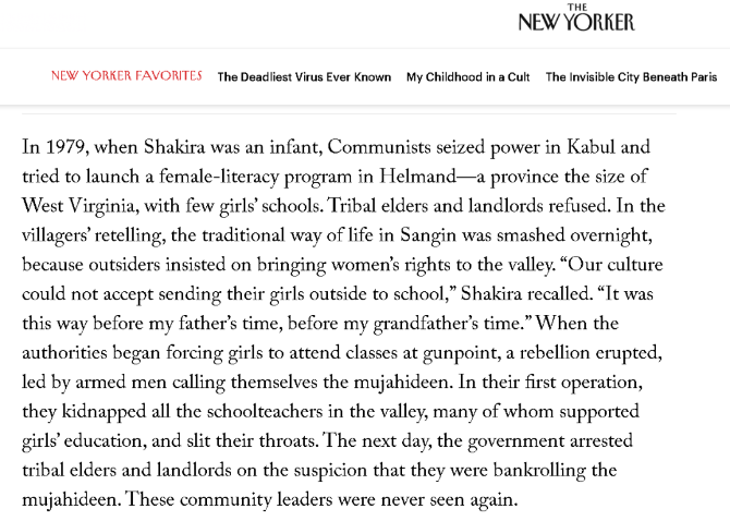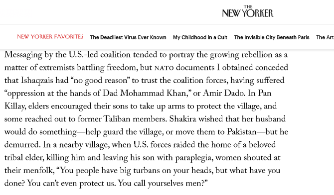 写到这里时,《纽约客》的作者特别强调说,虽然美国及其盟友很喜欢将阿富汗出现的各种“叛乱”说成是“极端分子”在对“自由”发动攻击,可至少在夏奇拉的村庄所在的桑金山谷地区,这里出现的“叛乱”是因为人们真的受够了美国的这些本土“伙伴”。实际上,就连北约的人都清楚,美国及其盟友在桑金山谷地区很不受欢迎,因为他们一直在遭受他们支持的阿米尔·达杜等势力的压迫。
