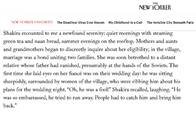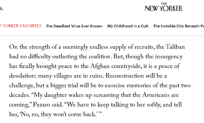最后,在这篇文章的结尾部分,《纽约客》的作者又将故事的主线转回到了阿富汗女性的权益问题上。毕竟,随着塔利班的归来,他们将如何统治阿富汗是眼下最受关注的一个话题。