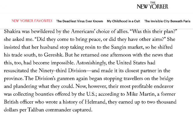 另外,《纽约客》作者还介绍了一件更为骇人听闻的事情:一位在夏奇拉所居住的赫尔曼德省工作的国际组织的人员透露,虽然阿富汗政府军后来不断输给塔利班,但政府军每丢失一处地方,就通过屠杀该地区的平民进行报复,而且下达这种屠杀令的阿富汗政府军指挥官萨米·萨达特,居然是一个在英国受过教育,并且被北约培训出来的高级军官。