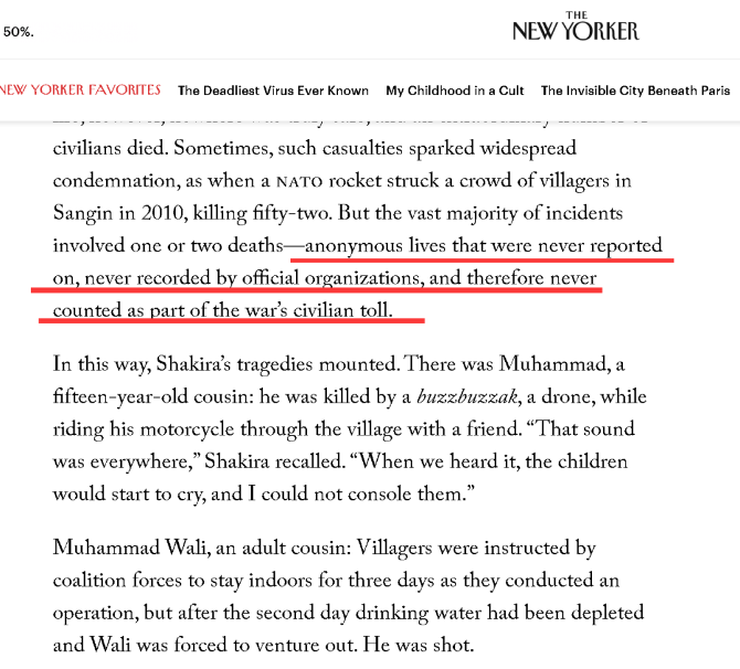 但美国并没有意识到这些微妙的变化,还在通过无差别的空袭和袭击,来制造着更多的敌意。《纽约客》的文章在此处介绍了大量夏奇拉的村子和附近的村子被美军的空袭炸得破碎,亲人被屠杀,村民无时无刻不生活在惊恐之中的案例,甚至于夏奇拉家族系谱整个一个分支中的叔叔和侄子,都在这些空袭中丧生,死了总共16个家庭成员——而且这样的遭遇并不仅仅只是她独有的,而是很普遍的。