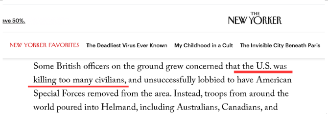 不仅如此,就连跟着美军一起来到阿富汗的英国军队,都觉得美军杀的平民“太多”了,想让美军从夏奇拉所生活的桑金山谷地区撤出去,但未能成功。