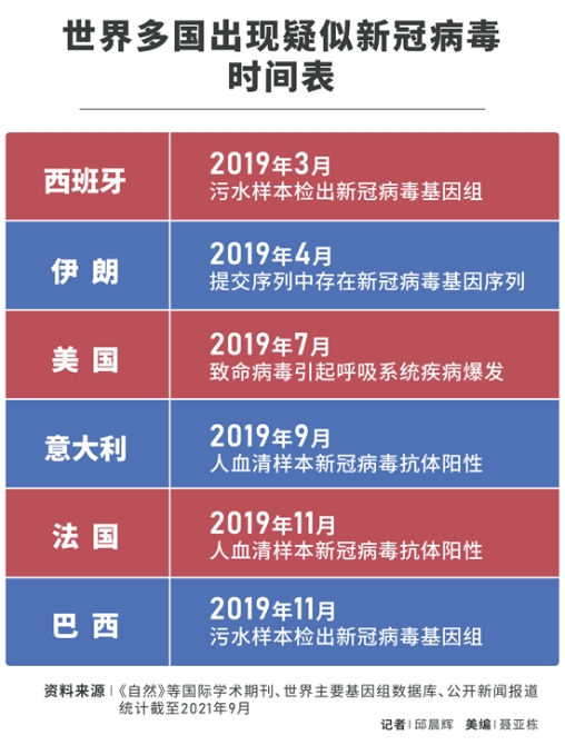 中青报·中青网记者采访国内权威专家,梳理国际学术期刊所发表的文献资料、世界主要基因组数据库、世界各地公开的新闻报道,通过人源样本核糖核酸(RNA)分子证据、血清学证据、废水样本RNA分子证据等多重科学证据印证:“时间线前移,新冠病毒多地多点起源”的全球疫情拼图,逐渐清晰地浮现出来。