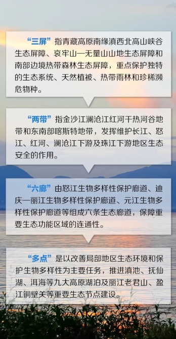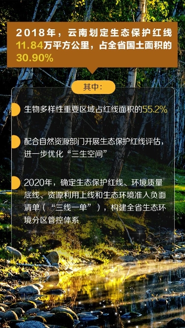 生态保护红线加强对典型生态系统的保护,涵盖了全省从热带到高山冰缘荒漠15个自然生态系统,自然保护地100%纳入生态保护红线;强化重要自然景观和自然遗迹的保护,涵盖了六大水系、九大高原湖泊、三江并流、热带雨林、澄江动物化石群、石林等重要自然景观和自然遗迹;