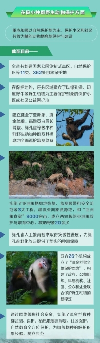 强化对重要物种栖息地的保护,亚洲象、滇金丝猴、绿孔雀、野生稻等众多珍稀濒危物种得到保存、发展,全省超过90%的国家重点保护植物和80%的国家重点保护动物得到有效保护;