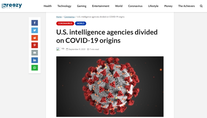 外媒BreezyScroll网站10日刊发名为《美国情报机构对新冠病毒起源存在分歧》的评论文章。