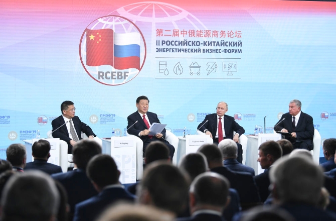 2019年6月7日,习近平在圣彼得堡同俄罗斯总统普京一道出席中俄能源商务论坛。