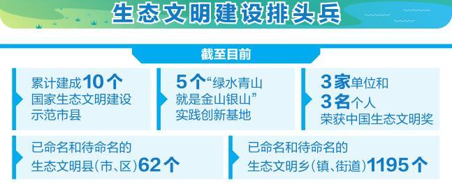 截至目前,全省16个州(市)、129个县(市、区)均开展了示范区创建工作,累计建成10个国家生态文明建设示范市县、5个“绿水青山就是金山银山”实践创新基地,3家单位和3名个人荣获中国生态文明奖。全省已命名和待命名的生态文明县(市、区)62个,占县域总数的48.06%;已命名和待命名的生态文明乡(镇、街道)1195个,占乡(镇、街道)总数的85.17%。
