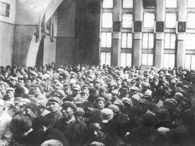 1945年4月至6月,党的七大在延安杨家岭中央大礼堂召开。主席台上方的横幅“在毛泽东的旗帜下胜利前进”,同会场后面的题词“同心同德”,烘托出会议的主题。党的七大使全党在马克思列宁主义、毛泽东思想的基础上达到空前的团结。图为七大会场(资料图片)。