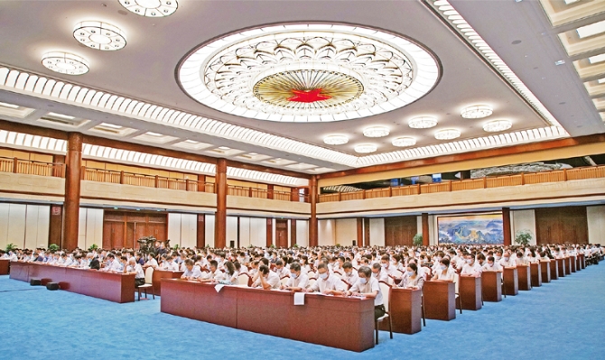 2021年7月,中央宣传部、中央党史和文献研究院、中央和国家机关工委、教育部、中央军委政治工作部、中共北京市委在京联合举办学习贯彻习近平总书记“七一”重要讲话精神系列专题宣讲报告会。图为7月5日拍摄的报告会会场。 新华社记者 陈晔华/摄
