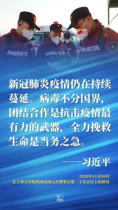 疫情暴发以来,上合大家庭高举团结抗疫旗帜。从一批批医疗物资到一瓶瓶疫苗,从一场场“云会议”到一支支医疗队,中国为构建上合卫生健康共同体作出积极贡献。