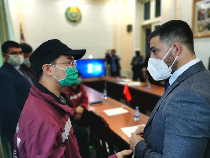 2020年4月20日,在乌兹别克斯坦费尔干纳州,肯热巴耶夫(右)与中国政府联合医疗工作组成员交流。