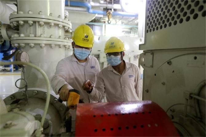 穆尼卜(右)与中国同事在检查设备运行情况。