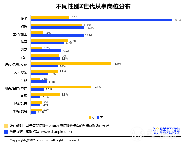 “Z世代”男性中,管理者占比22.8%,高于“Z世代”女性管理者近10个百分点。“Z世代”男性员工的平均薪酬是6726元,比女性员工的平均薪酬5831元高出近1000元。“Z世代”女性主要分布在财务岗、行政岗,比例分别是16.1%、12.1%,而男性员工更多分布在技术岗,占比达到28.1%,技术岗女性员工比例仅为7.7%。